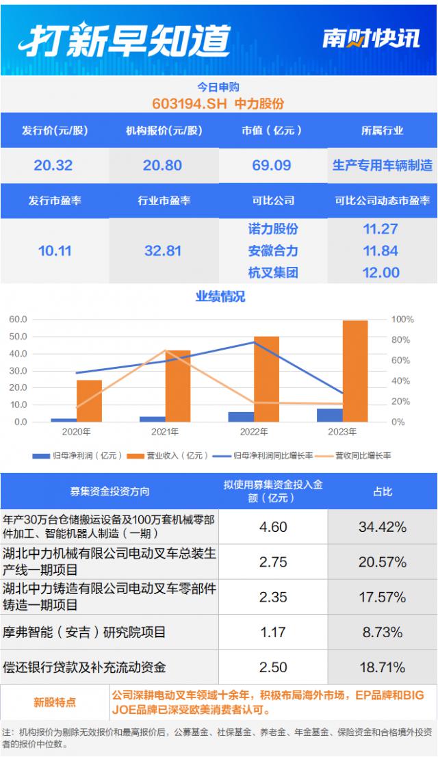 12 月 13 可以认购上交所上市的中力股权(603194).SH),该公司是一家专注于R&D的高新技术企业,生产和销售电叉车等机动工业车辆。 2021 年到 2024 年 6 月份,其主营业务收入占营业收入的比例均在 98% 以上。