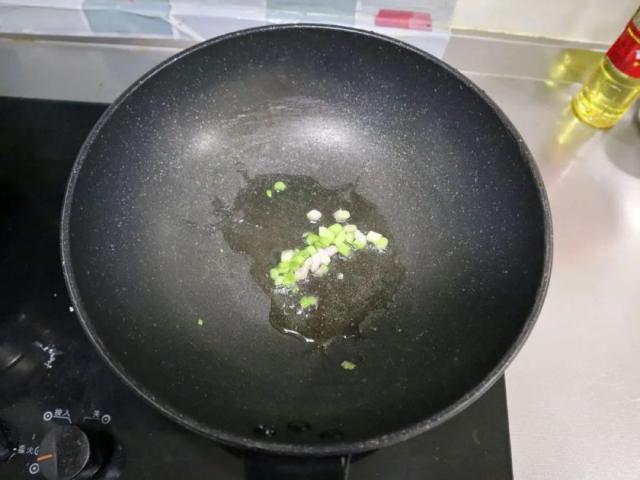 锅里放一点底油,葱白剁碎炸香。