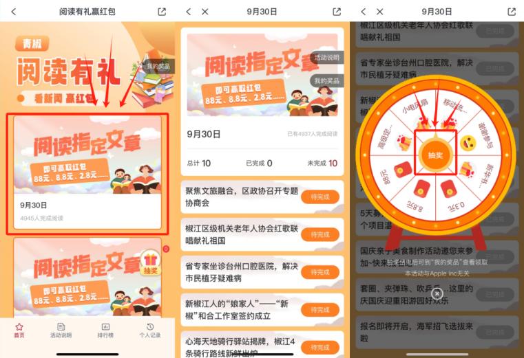 2.点击完成日期内的文章,每次阅读完10条新闻,就可以获得一次抽奖机会(阅读时间不宜过短,否则会提醒“阅读过快”)。