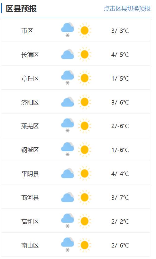 15日晴,南风2~3级,济阳区、莱芜区、钢城区、商河县、南山区、起步区最低温度约为-6℃,市区等区县最高温度约为-2℃。