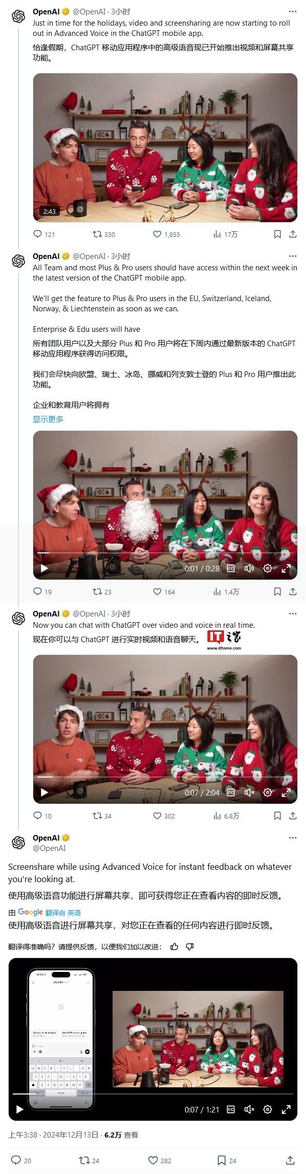 IT 世家 12 月 13 日消息," OpenAI 12 “天”活动已经进入第六天,OpenAI 公司宣布为 ChatGPT 高级语音模式带来视频输入和屏幕共享功能,并且为了迎接圣诞节,限时推出了全新的圣诞老人模式。