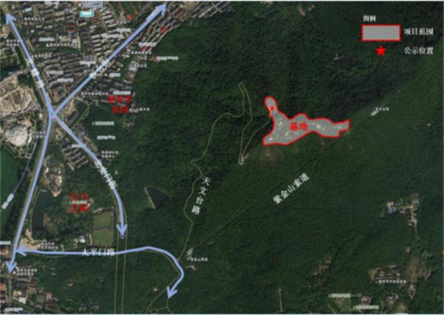 紫金山天文台位于钟山风景名胜区山区。土地范围为中国科学院紫金山天文台紫金山园区。目前,庭院的墙壁围绕着区域,土地面积约 5.4 公亩。