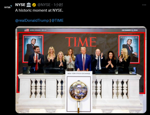 纽交所在官网写道,特朗普和洲际交易所为了纪念特朗普被《时代》杂志评为年度人物,(ICE)还有《时代》杂志的两位CEO,以及纽交所总裁Lynnn Martin一起敲响了开市钟。