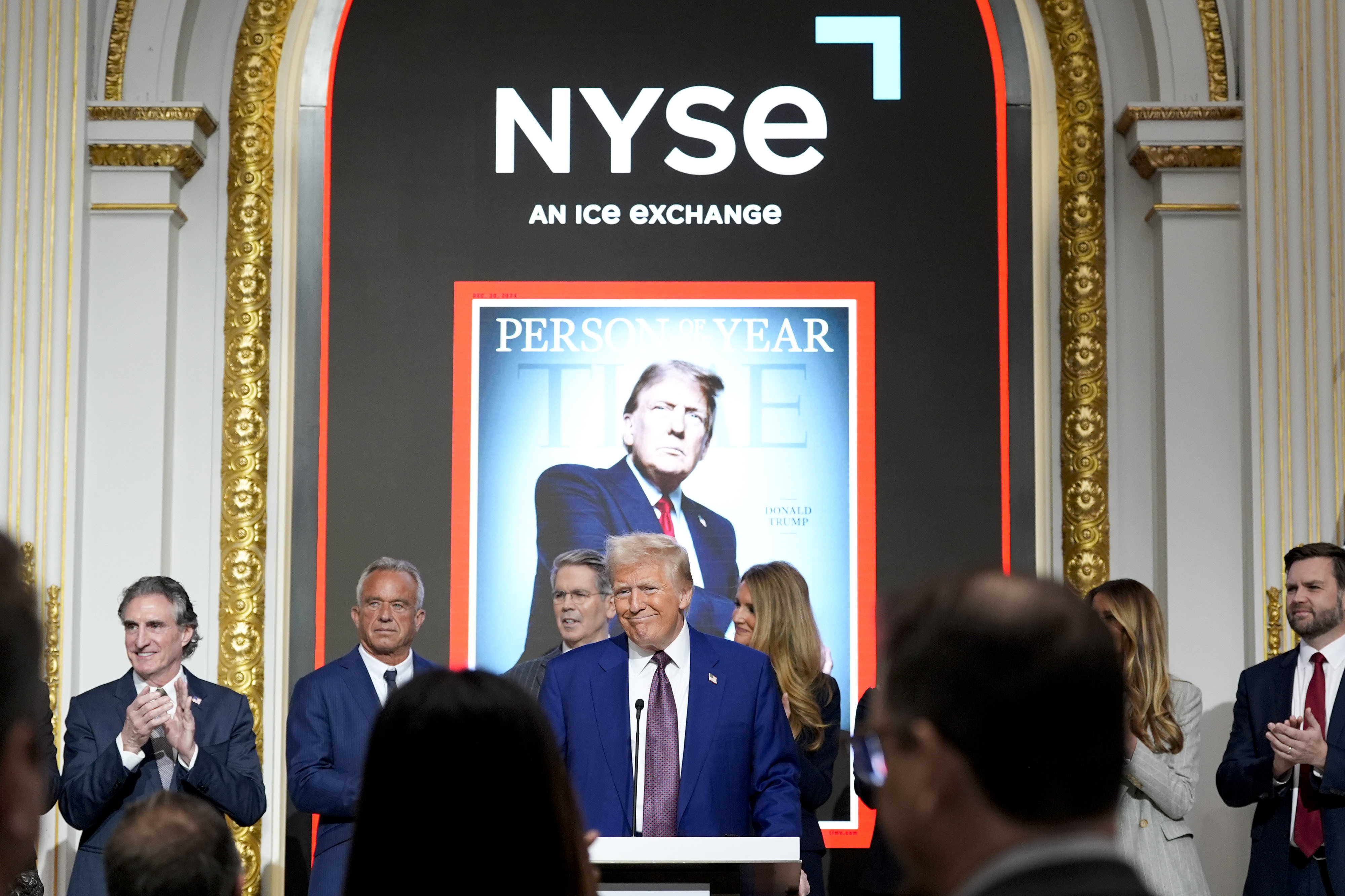 周四,美国当选总统特朗普在纽约证券交易所敲响了开市钟,当天他被《时代》杂志评为2024年人物。