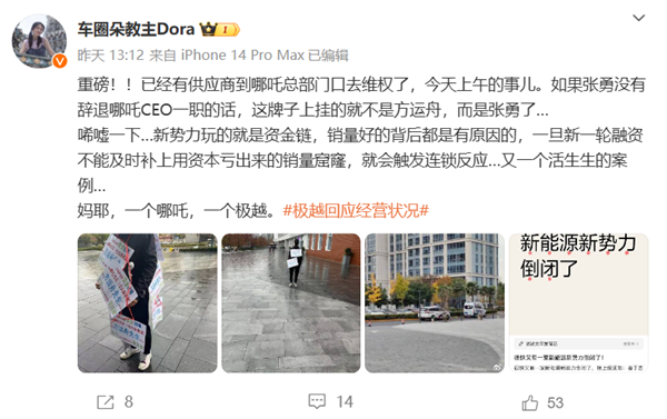 一位博主爆料称,近日已有供应商前往哪吒总部维权。