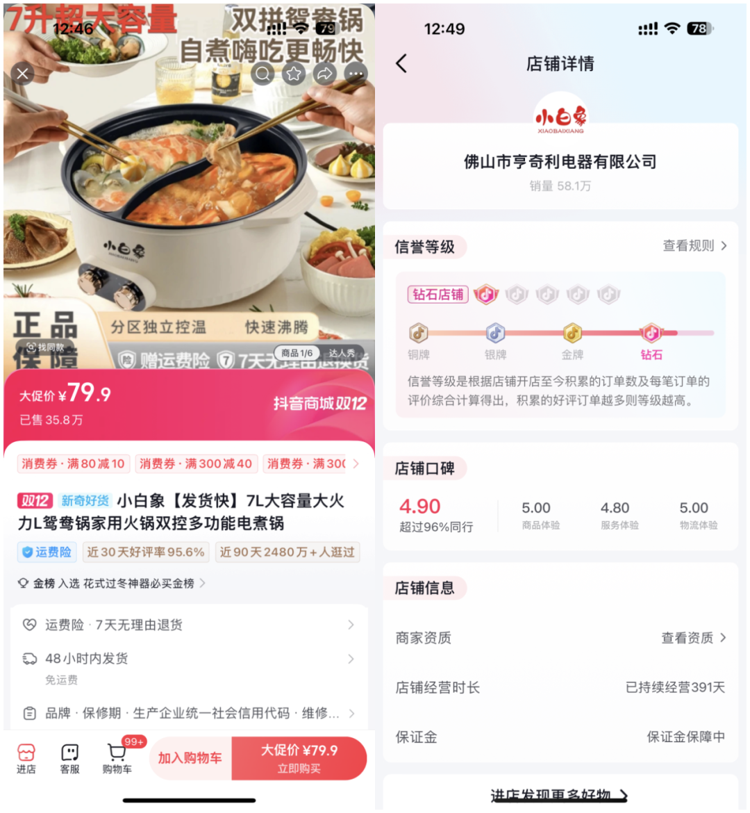 而且利用供应链的优势,小白象在短短一个半月内迅速推出了一款鸳鸯电火锅新产品。7升的大容量可以满足多人聚会的需求。双温双控的分区设计可以调节两个区域的温度,加上79.9元的定价和不输大牌的美观设计,几乎解决了所有现有用户的痛点。他说:“虽然那时我们知道这种产品会爆炸,但是我们不知道它会爆炸到这种程度。”乐辉说,“抖音电商很容易爆炸,只要你的产品好,自然就会有流量。”