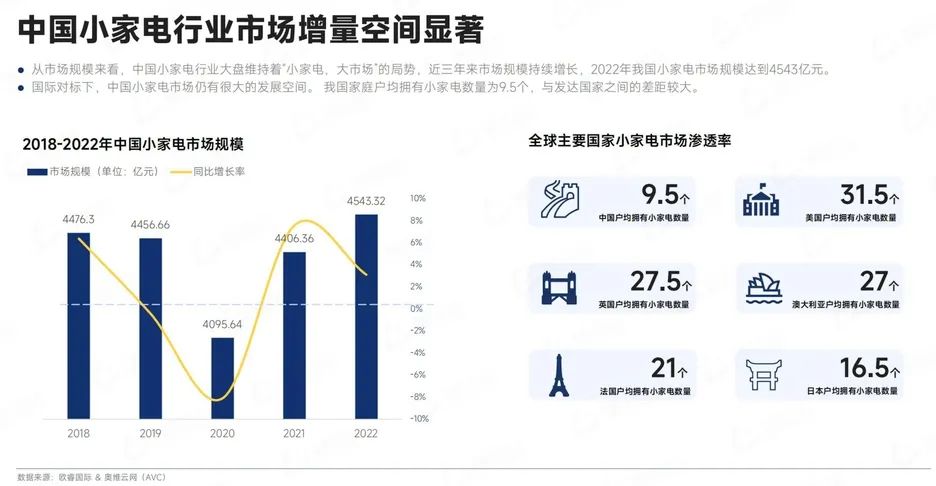根据《小家电行业研究报告》,早在2022年,我国小家电市场规模就已超过4000亿元,中国每个家庭平均拥有的小家电数量甚至达到9.5个。