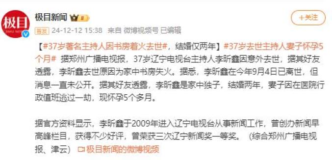 据郑州广播电视报道,37岁的辽宁电视台主持人李昕鑫意外去世。据他的朋友说,李昕鑫死于家庭自习室。据悉,李昕鑫今年9月4日去世,但消息尚未公开。据他的朋友说,李昕鑫是家里唯一的孩子。结婚两年,妻子怀孕五个多月,因为她在医院行政值班。