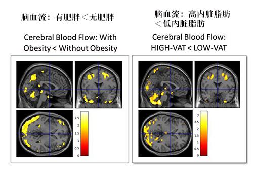 对比65名认知正常的中年人的脑血流,说明肥胖和内脏脂肪组织高的人大脑颞叶和顶叶血流量下降。北美放射学会图,健康时报翻译