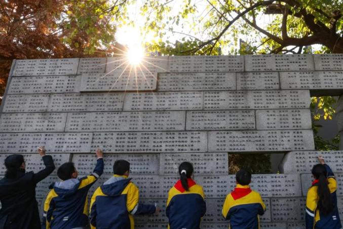 2023年,在纪念馆“哭墙”之前,一群孩子为南京大屠杀死难者的名字描新。