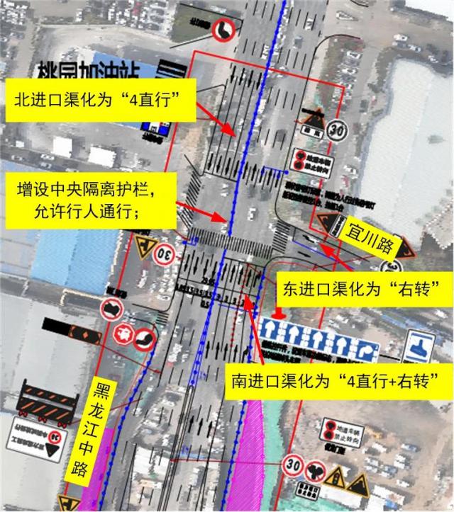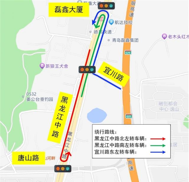 2. 原黑龙江中路东辅道南向北在宜川路口左转或调头的车辆需要直行到磊鑫大厦门前的路口掉头,沿着黑龙江中路通行;