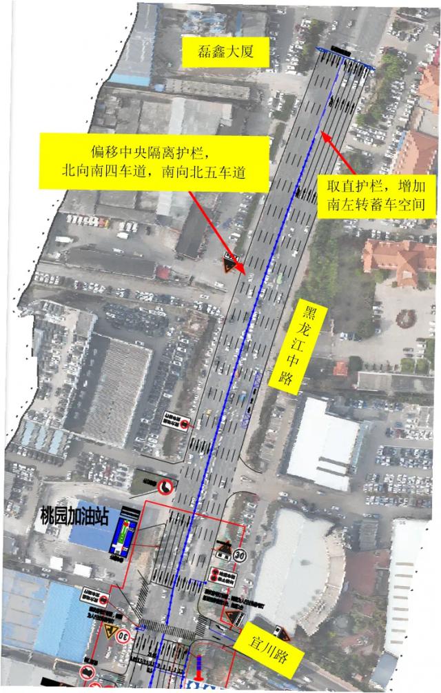 偏移黑龙江中路(宜川路) - 雷信大厦前)道路中央隔离护栏,朝北南渠化四车道,朝南北渠化五车道,增加了黑龙江中路雷信大厦前路口南左转储车空间,进口虚实线,方便转车通行。
