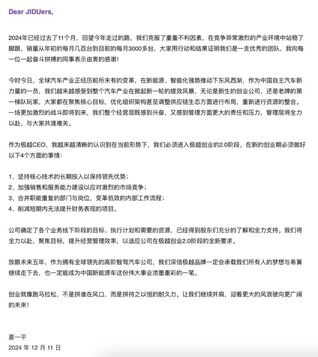 正是12月11日夏一平为所有员工发起的视频会议,让极越员工“度过了一个糟糕的一年”。这次沟通的核心内容是内部调整,夏一平表示要进入“创业2.0阶段”。