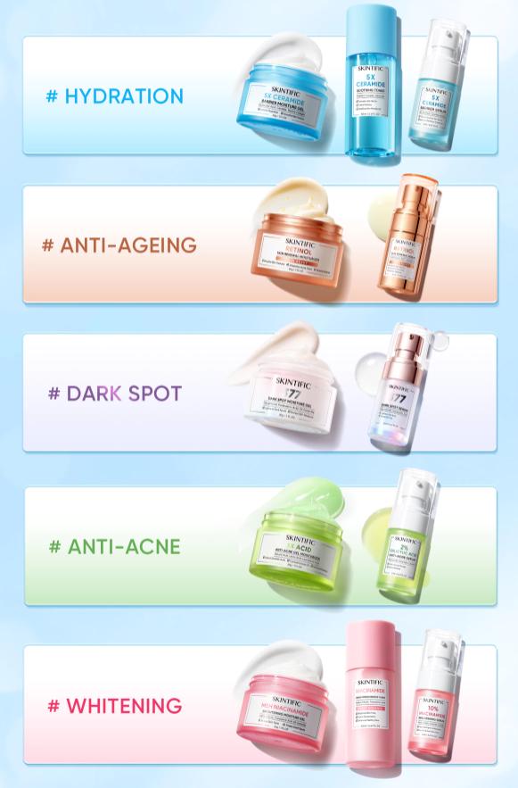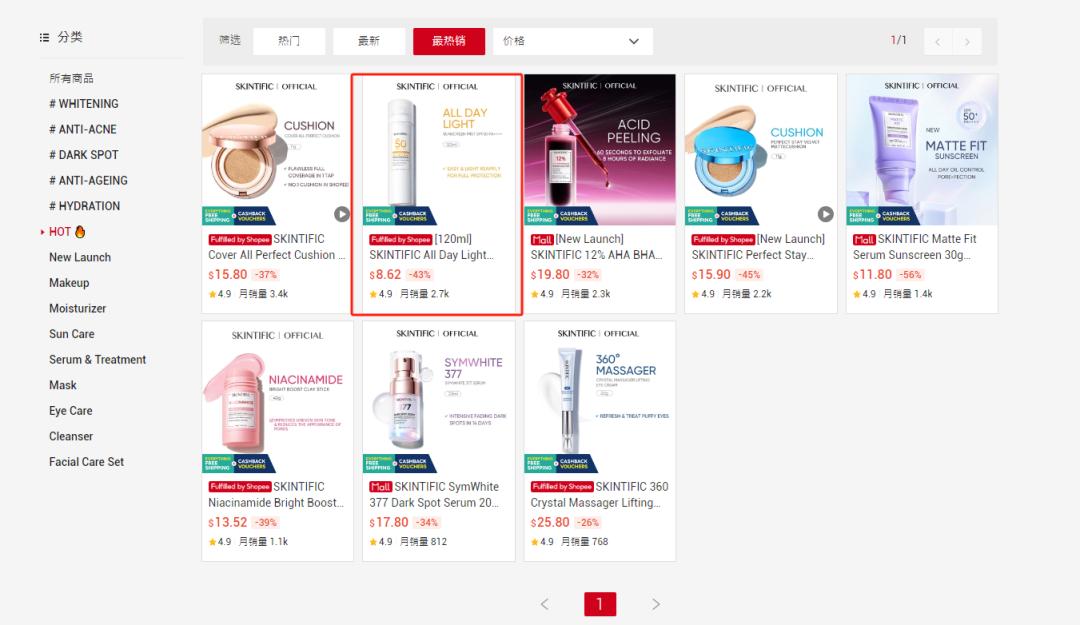 Skintific摆脱了低价思维,强调性价比:价格从10-25美元不等,价格中等,开发了美白、抗痘、祛黑斑、抗衰老、缓解保湿等一系列产品,而且SKU很多(超过80个)。Skintific的一些畅销产品,比如8.62美元的全天轻防晒喷雾,月销售额也可以超过2万美元(信息来源:Shopee)。