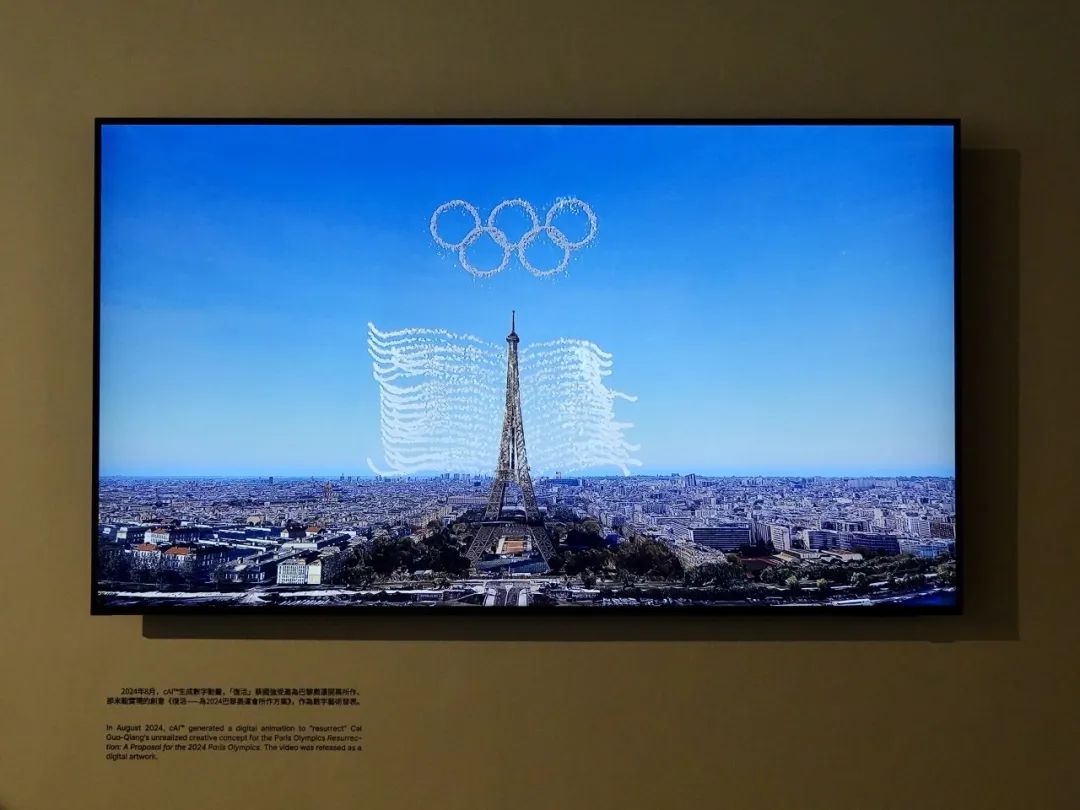 一进展厅,一台电视机就播放着。cAI™如何呈现蔡国强的烟火狂想?:在此之前,蔡国强为巴黎奥运会开幕式设计了白日烟火创意《复活》,这次烟火未能在巴黎上空点燃,但AI却在虚拟世界中完成了它。