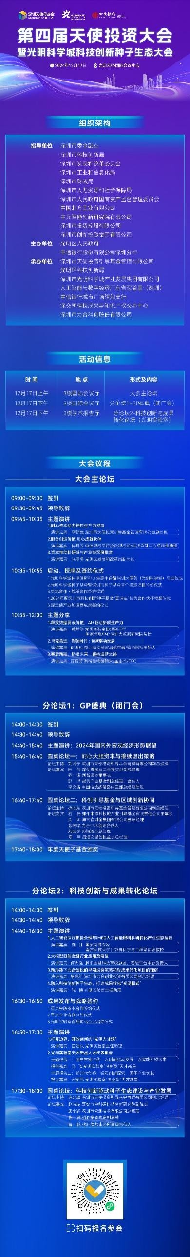 12月17日,光明区人民政府、中信银行股份有限公司深圳分行为主办方,由深圳市委金融办、市科技创新局、发改委、工信局、财政局、人力资源和社会保障局、国有资产监督管理委员会、中国北方工业有限公司、中兵智能创新研究院、深圳投资控制、深圳风险投资等指导单位,广东省人工智能和数字经济实验室(深圳)深圳天使投资引导基金管理有限公司、光明区科技创新局、深圳市光明科学城产业发展集团有限公司、作为承办单位,中信银行城市广场旗舰支行、深交所科技成果与知识产权交易中心、深圳李和科技创新有限公司第四届天使投资大会暨光明科学城科技创新种子生态大会(以下简称“大会”)将在光明云谷国际会议中心隆重举行。