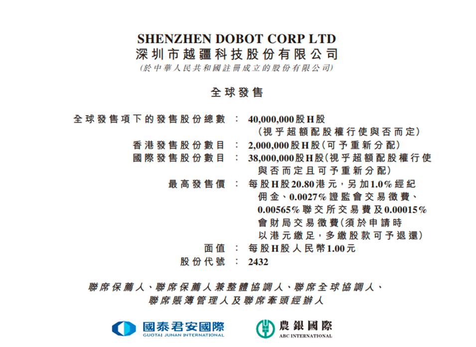 本次IPO每股招股价格为18.8-20.8港元,集资最高8.32亿港元。预计2024年12月23日上午9:00,香港时间股权将在联交所开始交易,国泰君安和农业银行国际将是联席保荐人。