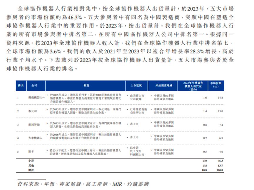 根据GGII数据显示,2023年,全球合作机器人销量达到9.99万台,同比增长27.26%,市场规模达到75.95亿元,同比增长21.93%。其中,在全球六轴或以上合作机器人市场份额中,优傲机器人、遨博智能、节卡机器人、发那科、法奥机器人、达明机器人、斗山机器人排名前七。前七名中没有越疆身影,这与财务报告信息不符。