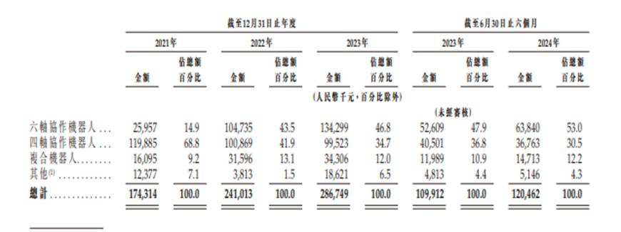 招股书显示,2023年,越疆六轴、四轴合作机器人实现销售额2374台、11782台,实现销售额1.34亿元、1亿元,占总销售额的46.8%、34.7%。