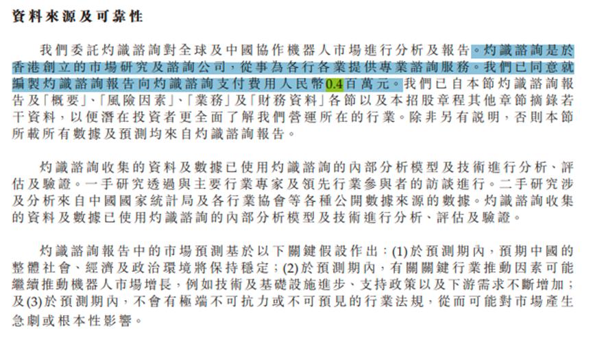 值得注意的是,根据燃烧咨询报告,根据2023年的出货量计,越疆在全球合作机器人行业排名前两,在中国所有合作机器人企业中排名第一,全球市场份额为13.0%。但在招股书中,越疆披露了全球和中国合作机器人的市场分析和报告,并委托第三方机构进行燃烧咨询。并且为此向对方支付了40万元。