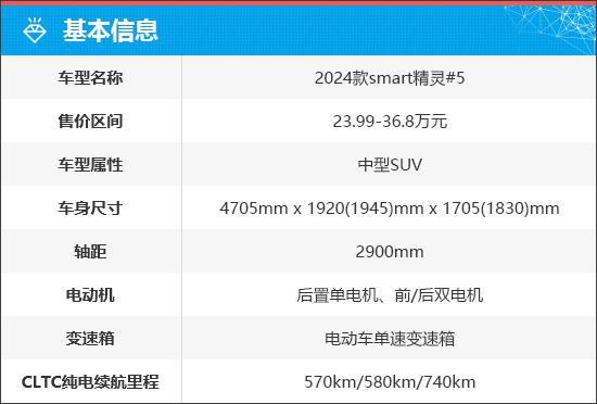 smart 精灵 #5 共推出 4 汽车,售价区间为 23.99-36.8 一万元。动力方面,新车提供两种选择:单电机和双电机。此外,除了入门级车型,其他三款车型都提供了丰富的包装供消费者选择。