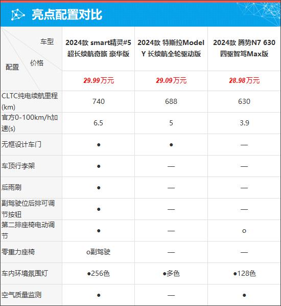 就车辆配置而言,我们选择了尽可能相似的车型。通过对比,smart 精灵 #5 不仅 CLTC 纯电续航里程最长,配备性能优异。独家车顶行李架、后雨刷、副驾驶座后排可调按钮、第二排座椅电动调节等基本功能,可选择副驾驶零重力座椅。相比之下,特斯拉 Model Y 和腾势 N7 装备性能比较接近,其中,腾势, N7 百公里只需 3.9s,满足年轻消费者对速度的追求。