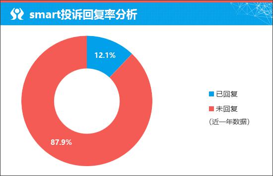 在衡量新车售后服务口碑方面,我们将通过企业对车主投诉的回应进行分析,对新车未来的售后服务口碑进行相对客观的预测。根据汽车质量网的数据,过去一年 smart 品牌投诉回复率为 12.1%,可见厂家对车主需求的关注度亟待提高。