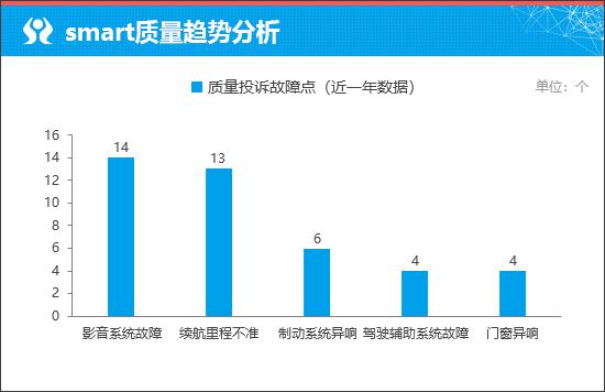 通过筛选 smart 其车型近一年的投诉数据可以发现,会有更多关于“视听系统故障”和“续航里程不准确”的投诉,大部分投诉集中在 smart 精灵 #1 车型上。因为 smart 精灵 #5 为了全新的车型,配备了桌面级 AMD V2000 并且采用芯片 800V 高压力平台建设,可以暂时认为其出现上述问题的几率非常低。但是具体情况如何,还要等到它用了一段时间才能得出结论。