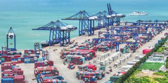 海口秀英港集装箱码头,货船在泊位上有序装卸,运输车辆来来往往,一派繁忙景象。记者 康登淋 摄