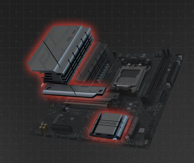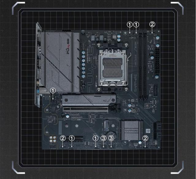 蓝宝石脉冲 B650M 上面有巨大的排热装甲,覆盖了供电区、南桥区和 M.2固态板区域,保证主板运行时的平稳排热,保证不会因温度过高而降频甚至断电。同时,排热盔甲上的盔甲装饰条也为主板增加了更多的个性化元素。
