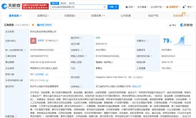 杭州山姆会员商店有限公司成立于2020年4月,由沃尔玛(中国)投资有限公司全资持有,法定代表人为郑硕怀,注册资本450万美元,经营范围包括药品零售、第三类医疗器械经营、食品销售等。