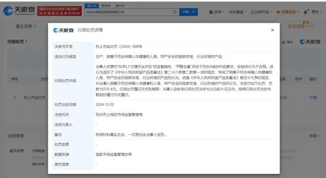 太突然!著名演员去世,作品家喻户晓。根据天眼查风险信息,杭州山姆会员商店有限公司近日因生产销售不符合国家标准和行业标准的商品,保障身体健康和人身财产安全,被杭州市上城市市场监督管理局罚款1.8万余元。处罚原因显示,经监督抽检,当事人运营的“60支LF兰精天丝床帽”“甲醛浓度”项目不符合A类纺织品要求,检测结论不合格。