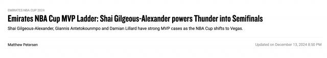 官方NBA杯MVP榜:亚历山大强登顶 前三位雄鹿双星申京排名第五。