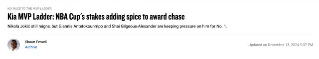 NBA官方MVP榜单:约基奇连续五周第一 詹皇获的提名是SGA的前三名。