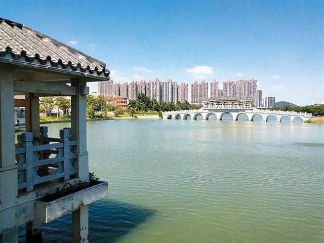 凤岗妈生态公园有十一座纵横湖泊的孔桥,连接喷泉广场和沿江大道。设计工艺独特,白天波光粼粼,夜晚灯火通明,令人眼花缭乱。几十个浸泡在水中的亭子融为一体,连续100米,穿梭其间,就像一个小迷宫,中山公园的九曲桥也是如此。站在亭子上,还能正面看到十一座孔桥的全貌。