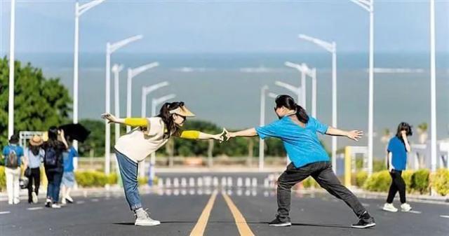 最近,每天晴天,去濠江。 “网红公路”打卡的市民和游客络绎不绝。这条路位于濠江东湖社区东湖一路,导航“汕头职业技术学院北门”,通过北门十字路口左转即可看到。这条网红路有什么特别之处?有人把这描述为“小北海”,也有网友说它是从“宫崎骏其人的夏天”中走出来的。亲自走在这条路上,可以发现沿途的道路是向海的,视觉上道路呈现出逐渐下坡的角度。海平线在地平线之上,道路的尽头似乎“通向”了深海。走在路上,你看到的是蓝色的海水和蓝色的天空。奇怪的角度让人感觉置身于天空之城,走向海底城市,很奇妙。蓝色的海水天空,点缀着道路两旁的白色路灯,阳光从后面照来,将人影温暖地投入地面。天气晴朗的时候,幸运的市民游客也可以眺望。 30 南澳岛公里外静卧海上,群山如淡墨。