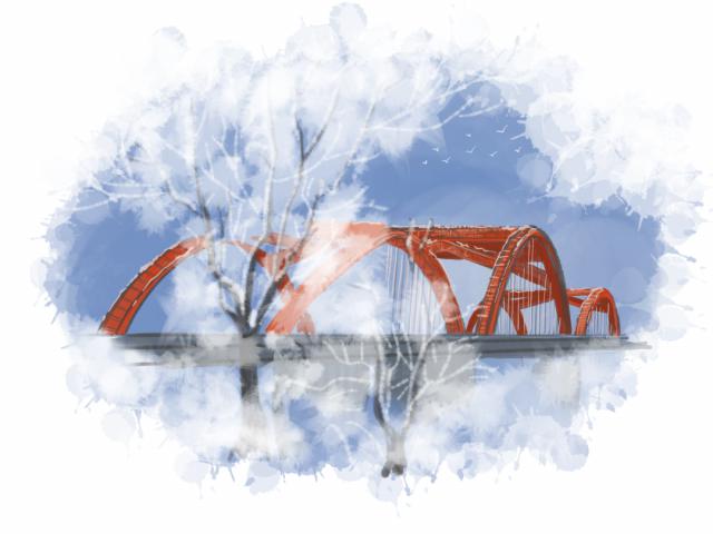 冬天,当朝阳在冉冉升起时,河岸上湿漉漉的雾气结晶的树木就像银菊,像珠链,伴随着河水和碧水,与蓝天相映成趣,从横跨的建筑到壮丽的建筑。