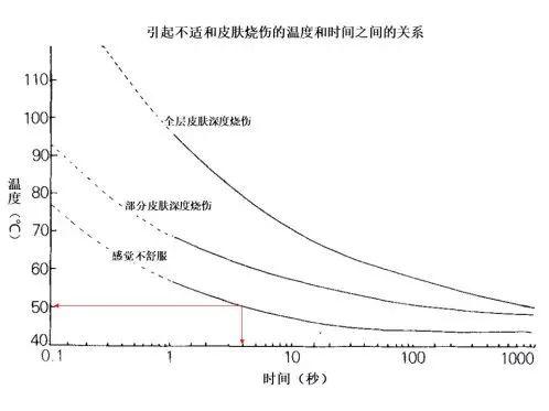 看看下图,50。 持续接触℃温度 5 秒人会感到不舒服,随着时间的推移,对皮肤的伤害也会增加。