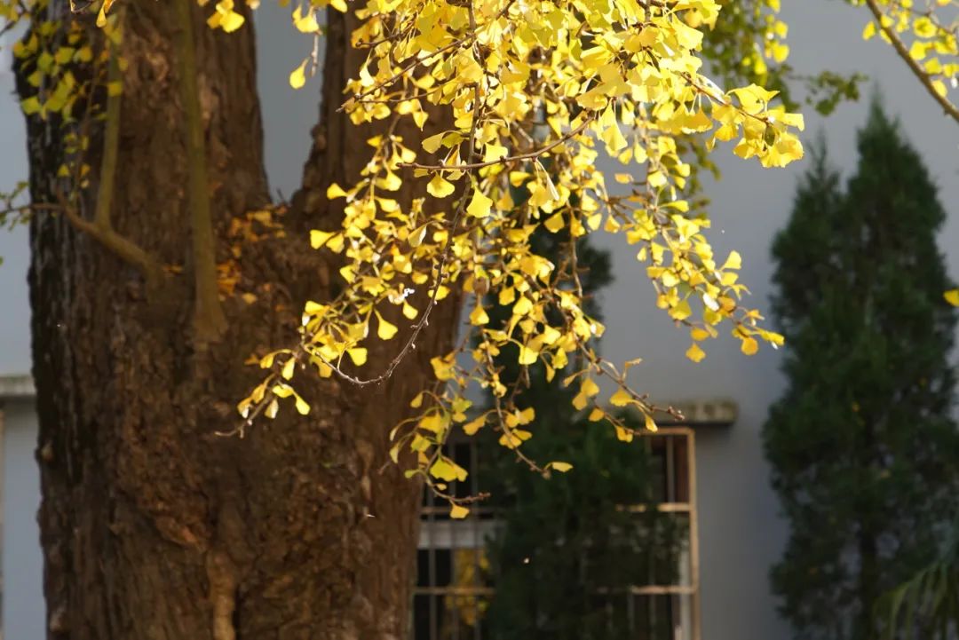 如果说枯叶是冬天风景的背景,那么最引人注目的“高光”一定是华丽的银杏树。银杏树枝繁叶茂,身材挺拔,银杏落叶散落在草地和石板路上。