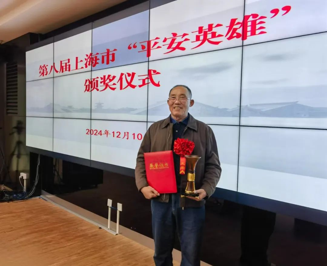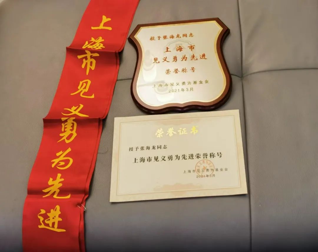 曾经是新城家园小区保安的张海龙,在2020年10月的一起持刀伤人案中,冲锋在前,从伤人男子手中夺下了利刃。因此,张海龙被选为2021年上海市见义勇为先进。今年,他又被评为第八届上海市“平安英雄”。十二月十日,颁奖典礼在广富林街道办事处举行。