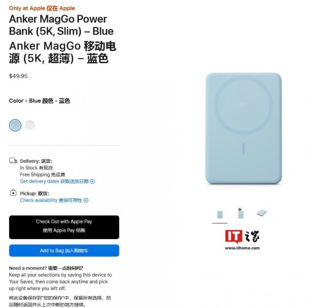 Anker MagGo 移动电源价格 49.95 美元(目前的约定) 363 人民币),有蓝色和白色可选。