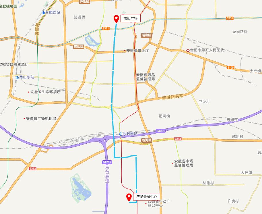 市政广场公交专线:滨湖会展中心-锦绣大道-庐州大道-大连路-徽州大道-市政广场。