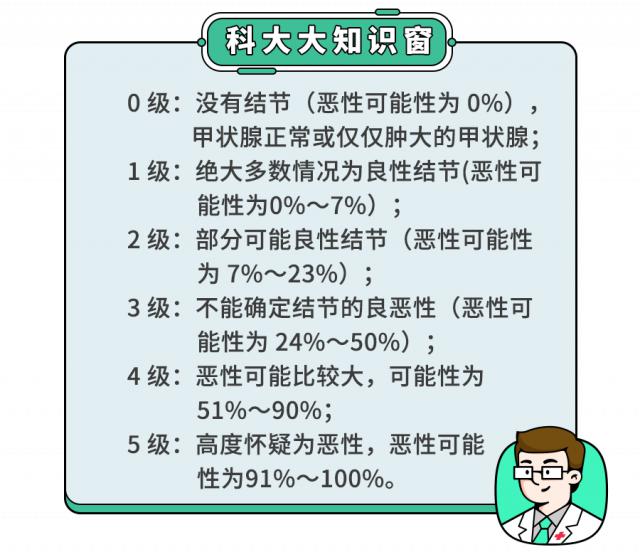 彩超单上的 TI-RADS 等级,就是甲状腺结节的等级。注:等级越高,恶性结节(即甲状腺癌)的可能性就越大。