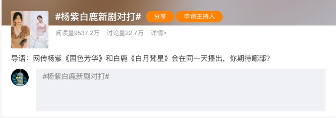 日前,话题#杨紫白鹿新剧对打#登上微博热搜,继虞书欣赵露思同台pk后,年底《国色芳华》《白月梵星》同天上线,有望再次掀起一波古偶仙侠剧的高潮。一个是传承技艺和文化的古老偶像,一个是女主修仙女成长的奇幻仙侠。这两部剧不会两败俱伤,而是从不同角度满足同一群观众的需求,为今年的古代偶像市场画上了圆满的句号。