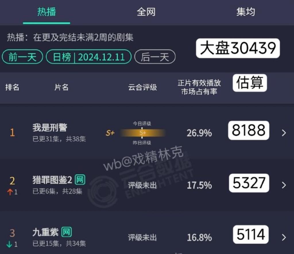 在此基础上,高开高走的《我是刑警》,“小黑马”“九重紫”,以及多平台播出且表现良好的《猎罪插画2》,成功接受了该剧观众的期待,为年底市场的升温增添了一把火。随着《我是刑警》开启“超点”,收视率有望再上一层楼。即将迎来男女婚礼的《九重紫》也将对腾讯视频的3万人气产生冲击,《猎罪插图2》的人气也有望在周末迎来新高。。