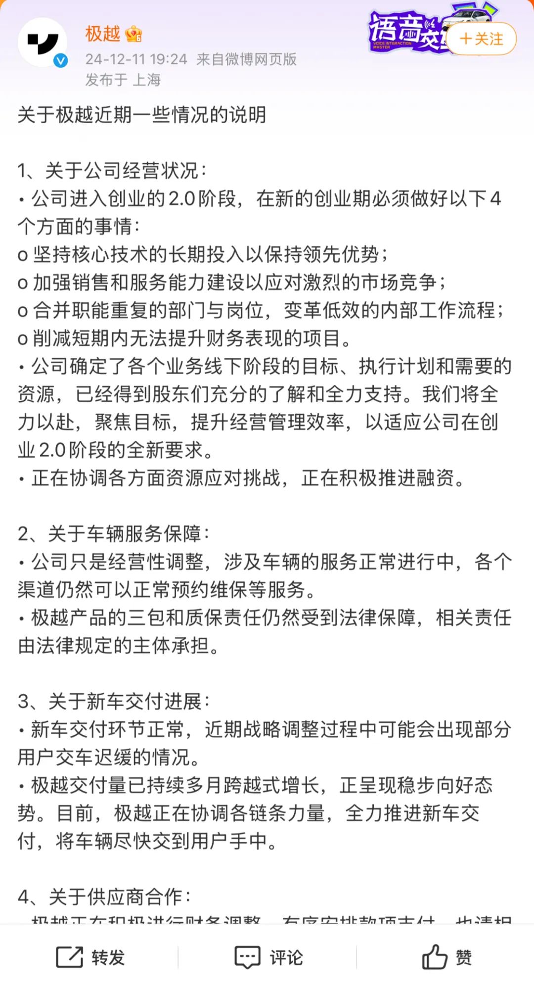 声明中没有提到后续极越经营的相关细节。