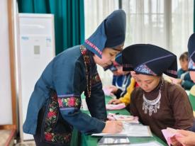 “这是我第一次绣壮锦。太有趣了。我必须非常小心地绣出来。我会尽力绣更多更好的刺绣。”来到白山镇合诚社区的绣娘蓝育芝说。