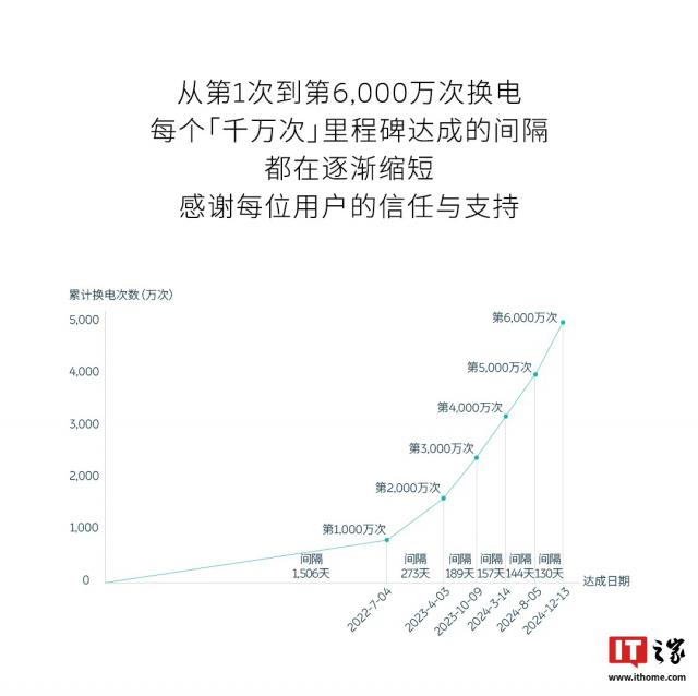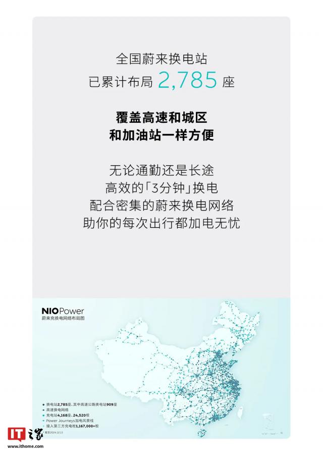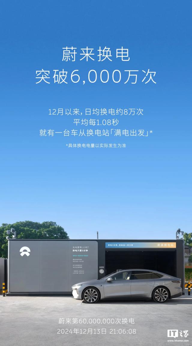 IT 世家 12 月 13 今天晚上,蔚来汽车官方宣布,蔚来换电突破 6000 万次。12 月份到现在,每天换电约 8 万次。
