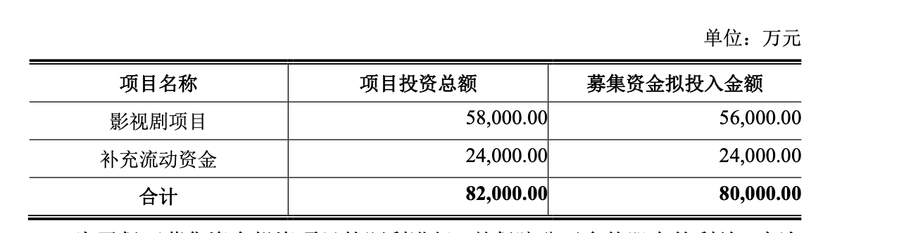 公告披露,影视剧项目总投资5.8亿元,拟投资5.6亿元;补充营运资金项目,总投资2.4亿元,拟投资2.4亿元。