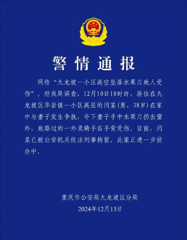 12月13日,重庆市公安局九龙坡区分局发布警报,称“九龙坡某小区高空坠物水果刀造成伤害”。经局调查,12月10日18时许,生活在九龙坡区华岩镇某小区高层的闫某(男,38岁)在家与妻子发生矛盾,将妻子手中的水果刀从窗外拿下,导致一名路过的外卖骑手右手背受伤。